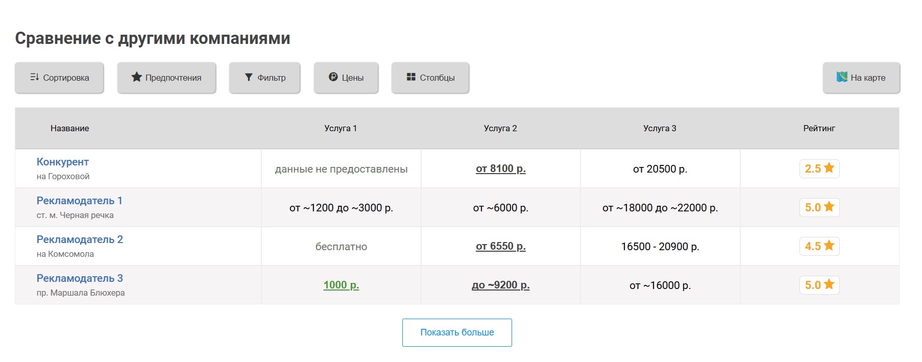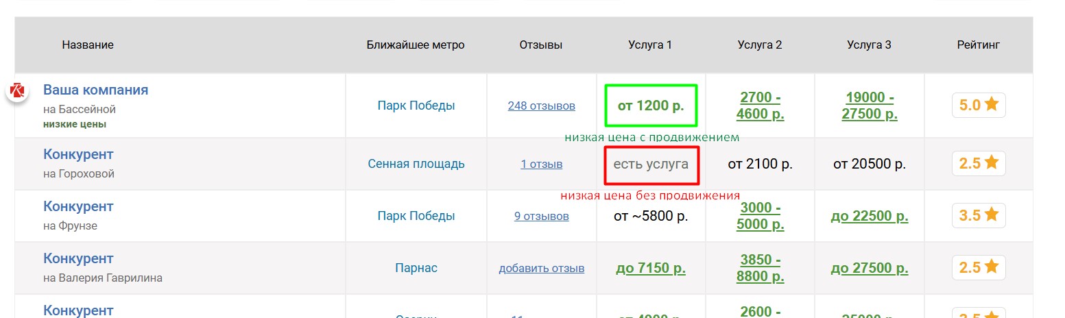 Вокруг продвигаемой таким образом фотостудии выбирается некоторое количество ближайших конкурирующих фотостудий, продвигаемая фотостудия попадёт к ним в таблицу «Сравнение по ценам», которая выглядит следующим образом: